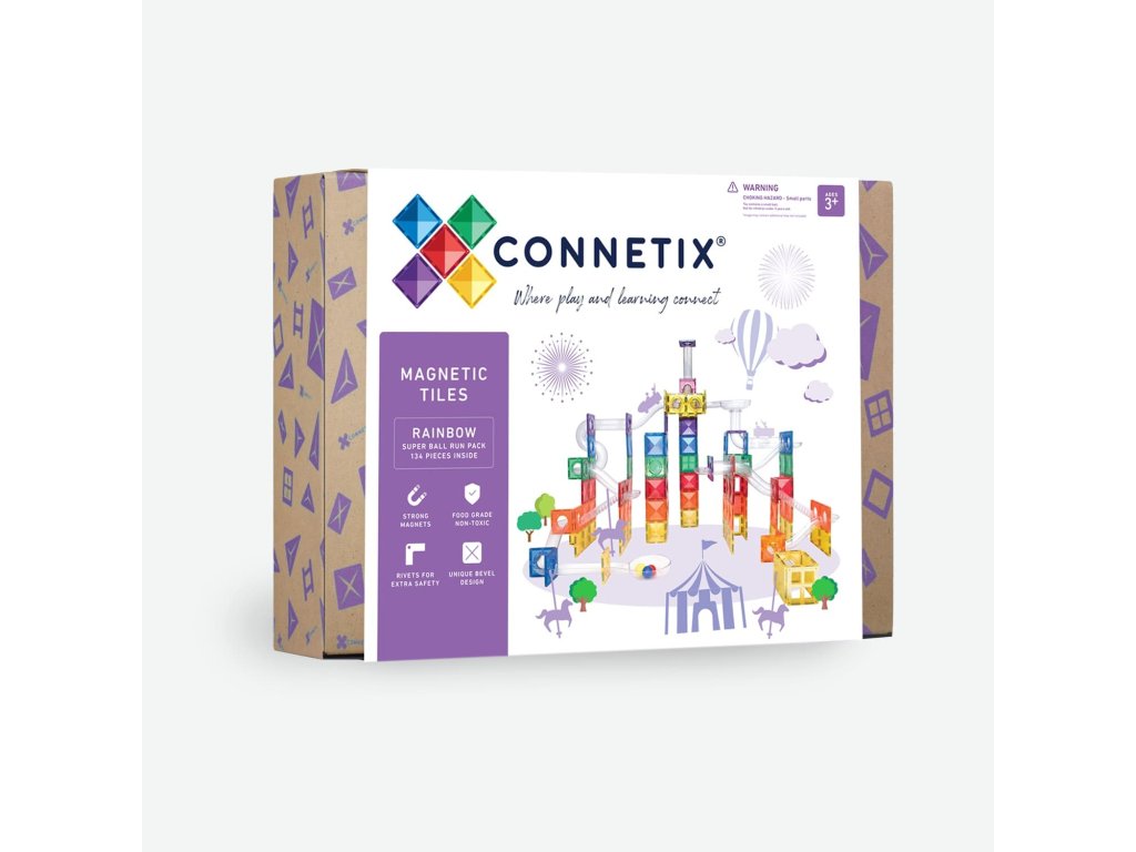 ato rozsáhlá sada magnetické kuličkové dráhy nabízí dětem (i dospělým) neomezené možnosti tvoření, objevování a zábavy. Oproti základním kuličkovým drahám od Connetixu obsahuje i klasické magnetické kostky – malé i velké čtverce – díky kterým postavíte pevný základ a můžete začít stavět hned, bez nutnosti dalších sad. Díky jedinečně navrženým dílkům si postavíte propracované tratě plné zatáček, mostů, křižovatek a zvukových efektů – a sledovat, jak šest barevných dřevěných kuliček sviští dolů.