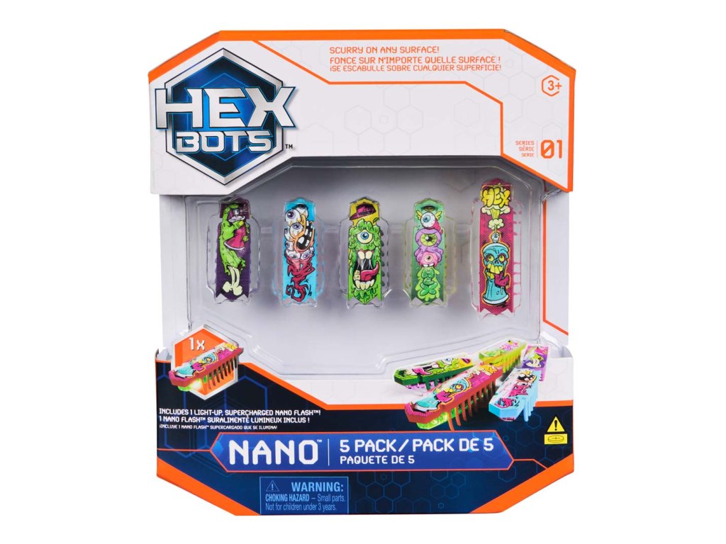 Zažijte spoustu zábavy s kolekcí HEX BOTS® Nano, která obsahuje 4 klasické Nano robotky s originálními grafickými designy a 1 speciální Nano Flash. Ten je větší, rychlejší a navíc vybavený LED světlem, které se při pohybu rozsvítí. Skvěle doplní hru s magnetickými stavebnicemi a kuličkovými drahami, kterým přidají nový rozměr pohybu a akce.