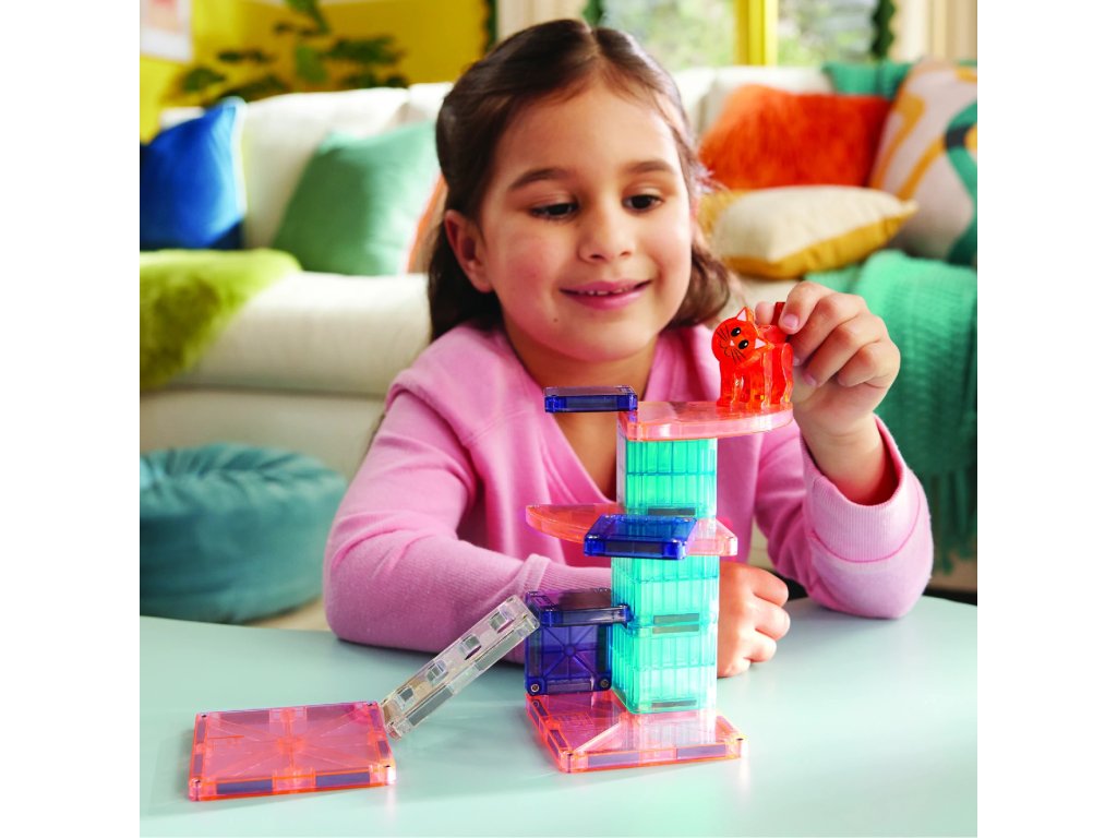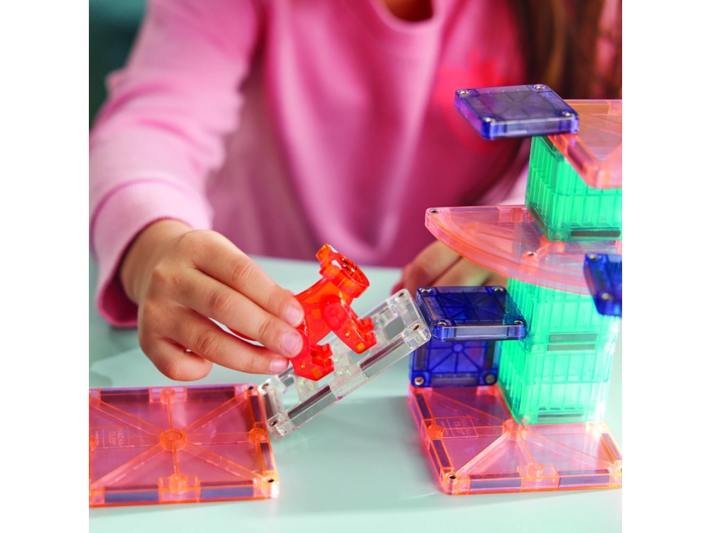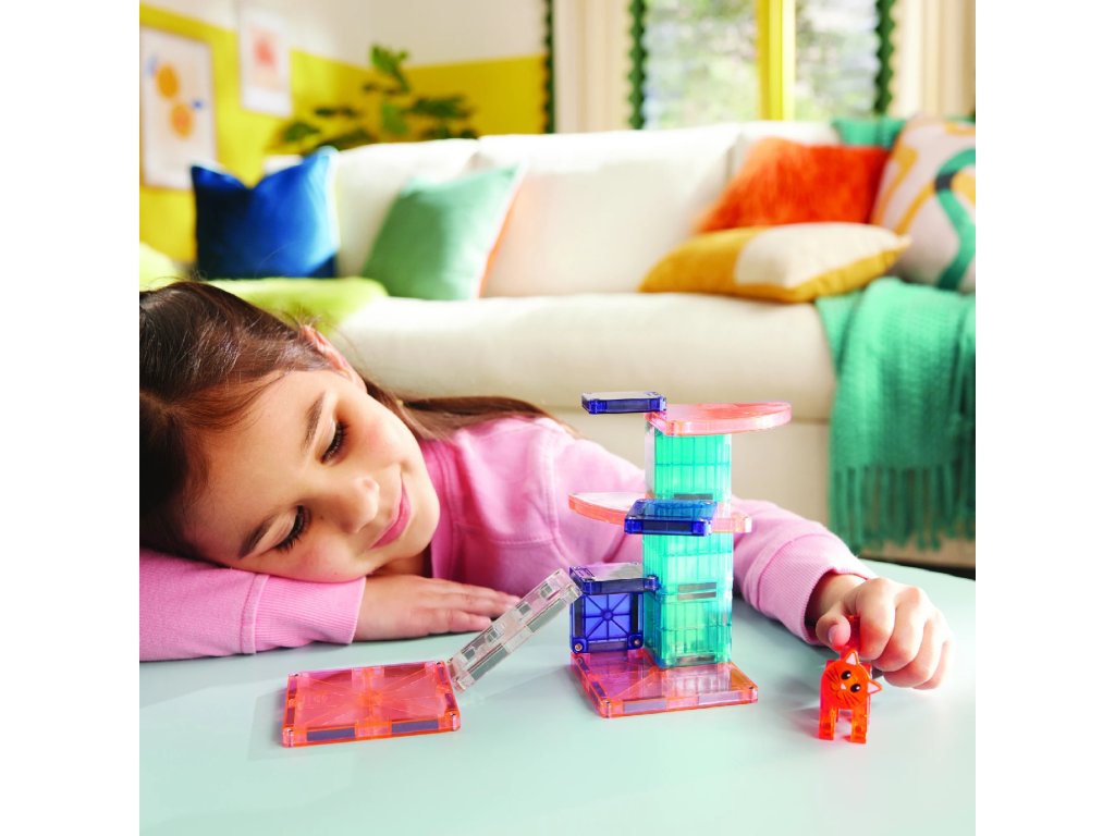 Magna-Tiles jsou originální magnetické stavebnice, které už více než 25 let inspirují děti po celém světě. Díky silným magnetům a barevným průhledným dílkům mohou děti snadno stavět trojrozměrné stavby – od jednoduchých věží až po složité konstrukce.