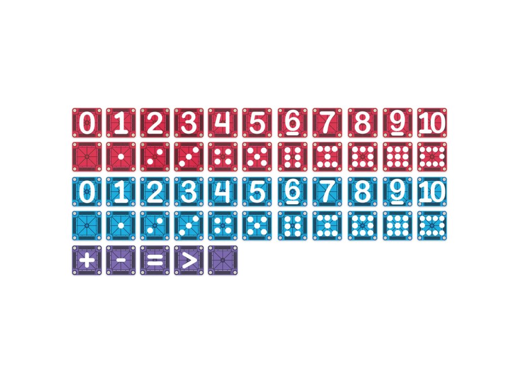 Barevně rozlišené číselné dílky v modré a červené barvě, dílky s tečkami a fialové dílky s matematickými symboly pomáhají dětem postupně přecházet od rozpoznávání čísel až k jednoduchým příkladům. Stavebnice přirozeně roste spolu s dítětem a přizpůsobuje se jeho schopnostem.