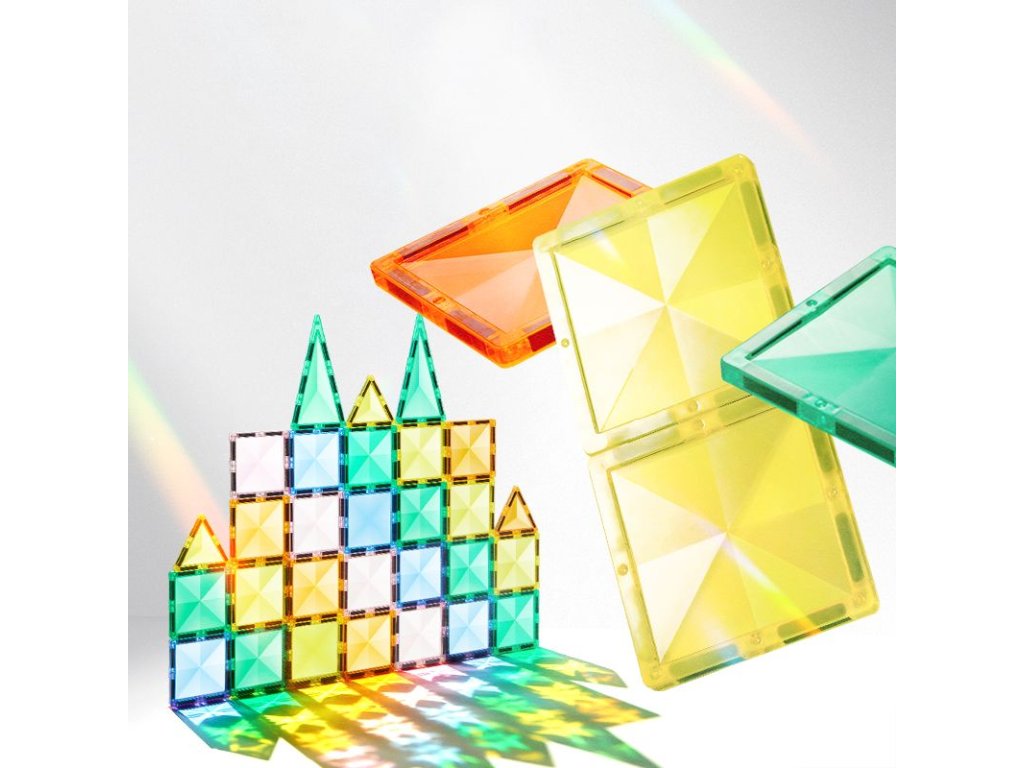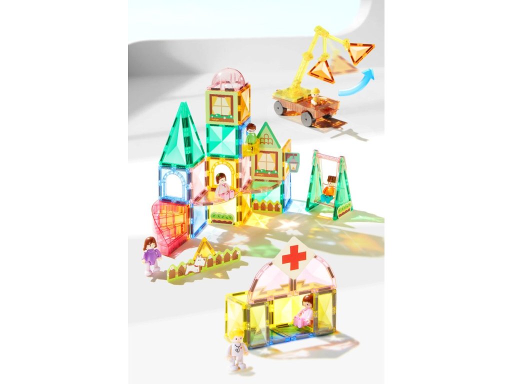 Barevné průhledné dílky se snadno spojují pomocí silných magnetů a díky postavičkám členů rodiny mohou děti vytvářet celé miniaturní světy – domečky, zahrady i města plná příběhů.