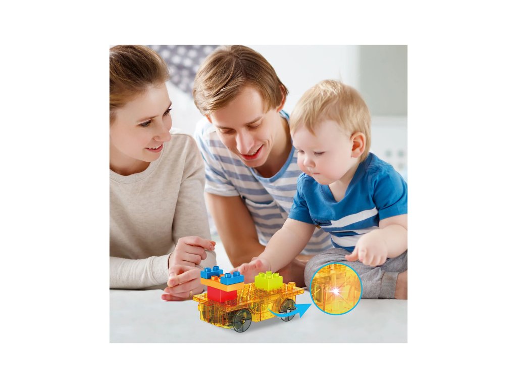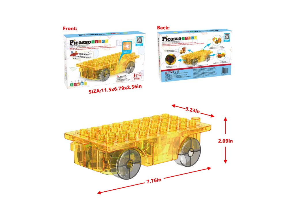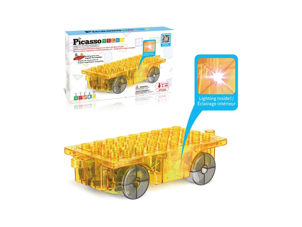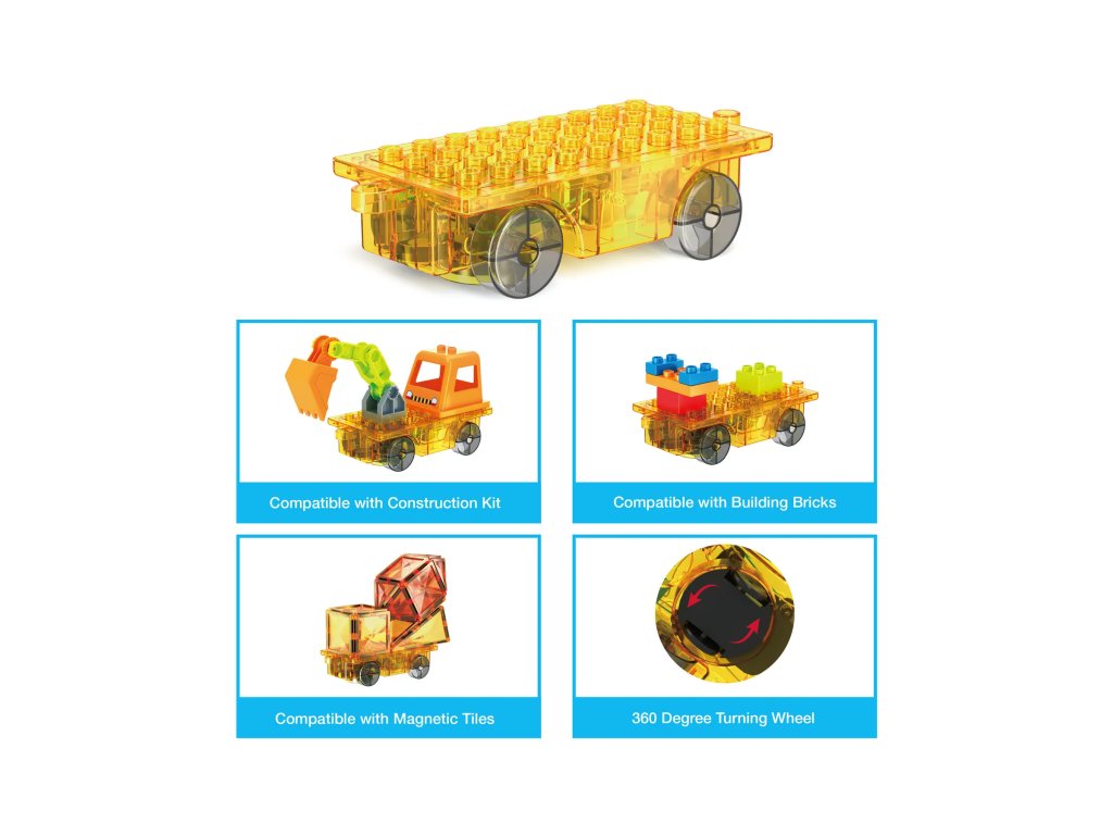 Rozšiřte svou magnetickou stavebnici o motorový podvozek, který dokáže jezdit, točit se a otáčet všemi směry. Tento podvozek na baterie je navržen tak, aby děti mohly stavět vlastní auta z magnetických dílků nebo kostek přímo na jeho horní část a sledovat, jak jejich výtvory ožívají v pohybu.
