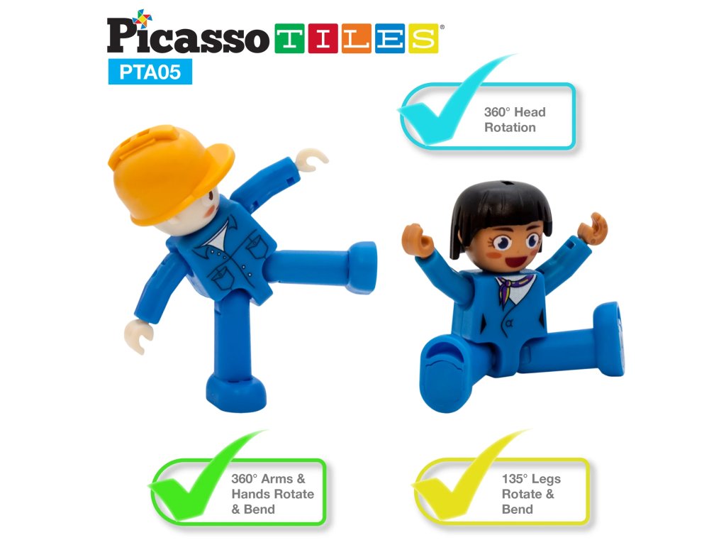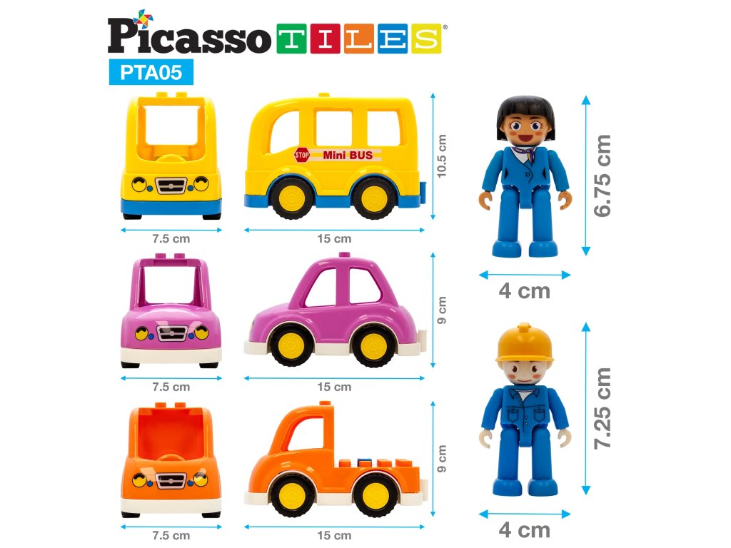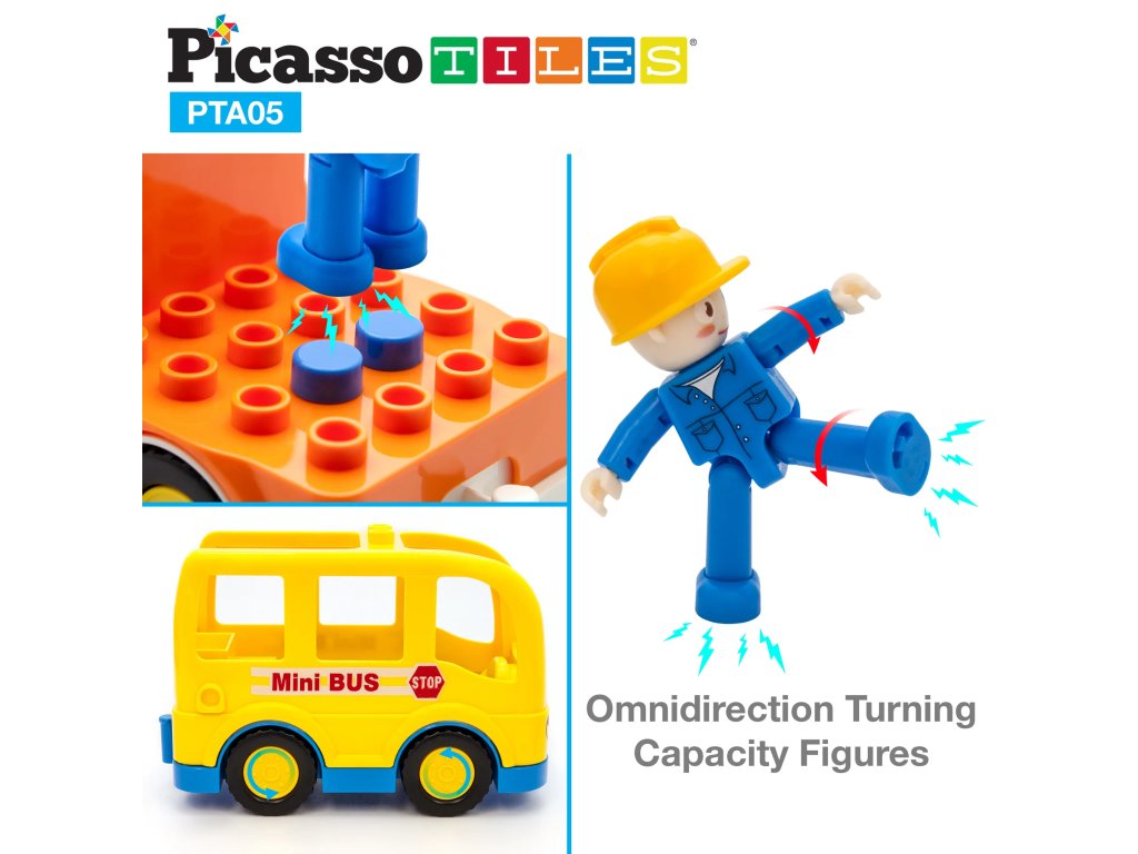Rozšiřte své magnetické stavebnice o akční postavičky a vozidla! Tato sada (SKU: PTA05) obsahuje 2 figurky řidičů a 3 různá auta – osobní vůz, nákladní auto a školní autobus. Postavičky mají pohyblivé části a magnetická chodidla, takže je lze snadno kombinovat s magnetickými dílky nebo stavebními kostkami.