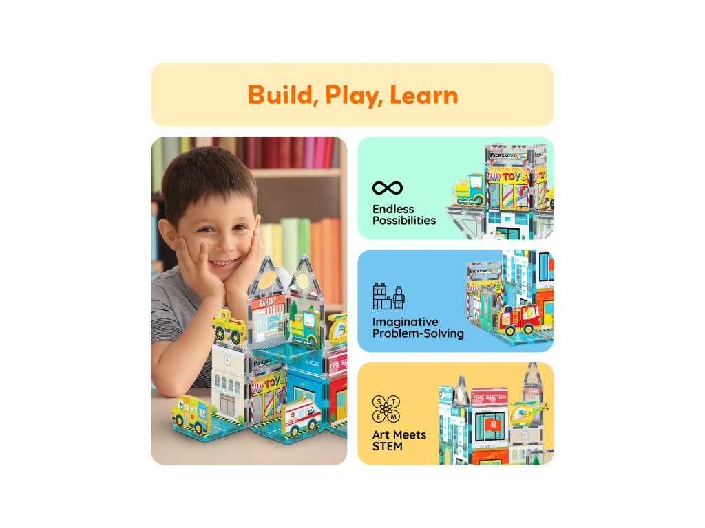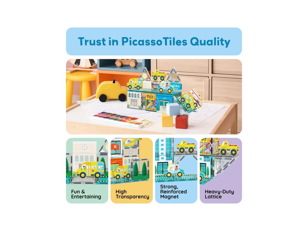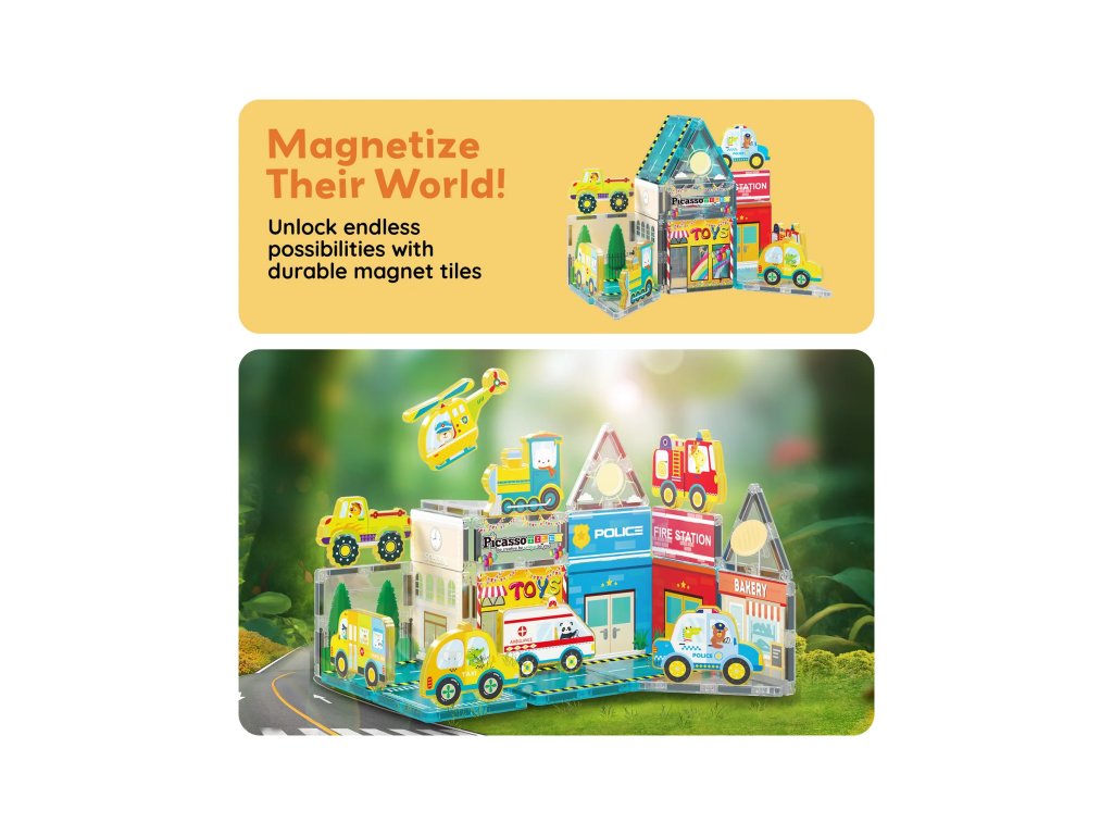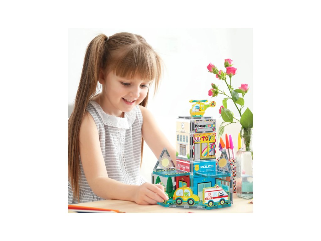 PicassoTiles jsou kreativní magnetické stavebnice, které otevírají dětem nekonečné možnosti tvoření. Barevné průhledné dílky se spojují pomocí silných magnetů a umožňují stavět od jednoduchých věží až po složité 3D konstrukce.