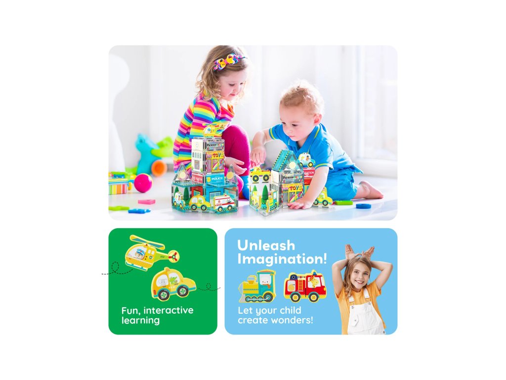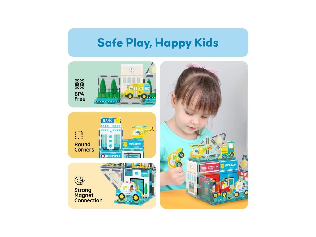 Postavte si vlastní město plné života a dobrodružství! Sada Metro City přináší potištěné magnetické dílky a 8 vozidlových figurek, se kterými si děti mohou vytvořit ulice, domy i dopravní scénky podle své fantazie. Je to ideální sada pro malé stavitele, kteří rádi objevují svět města plný aut, budov a každodenních příběhů.
