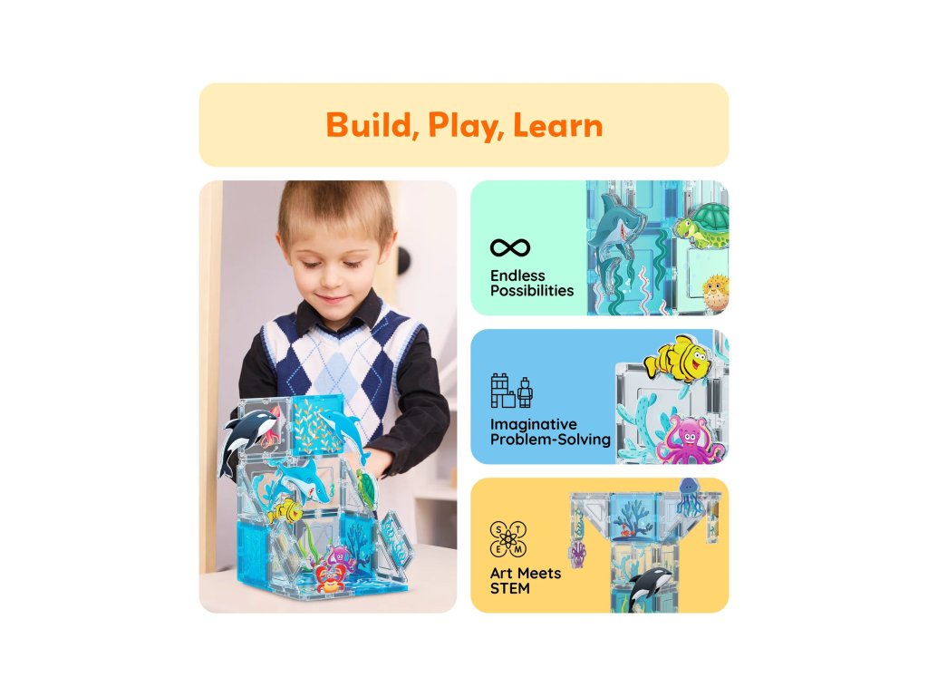 Objevte kouzlo podmořského dobrodružství! Sada Mořský svět přináší potištěné magnetické dílky a 8 figurek mořských živočichů, se kterými si děti postaví vlastní akvárium nebo podmořskou scénu plnou fantazie. Od delfína přes želvu až po žraloka – každý dílek inspiruje k objevování a vyprávění nových příběhů.