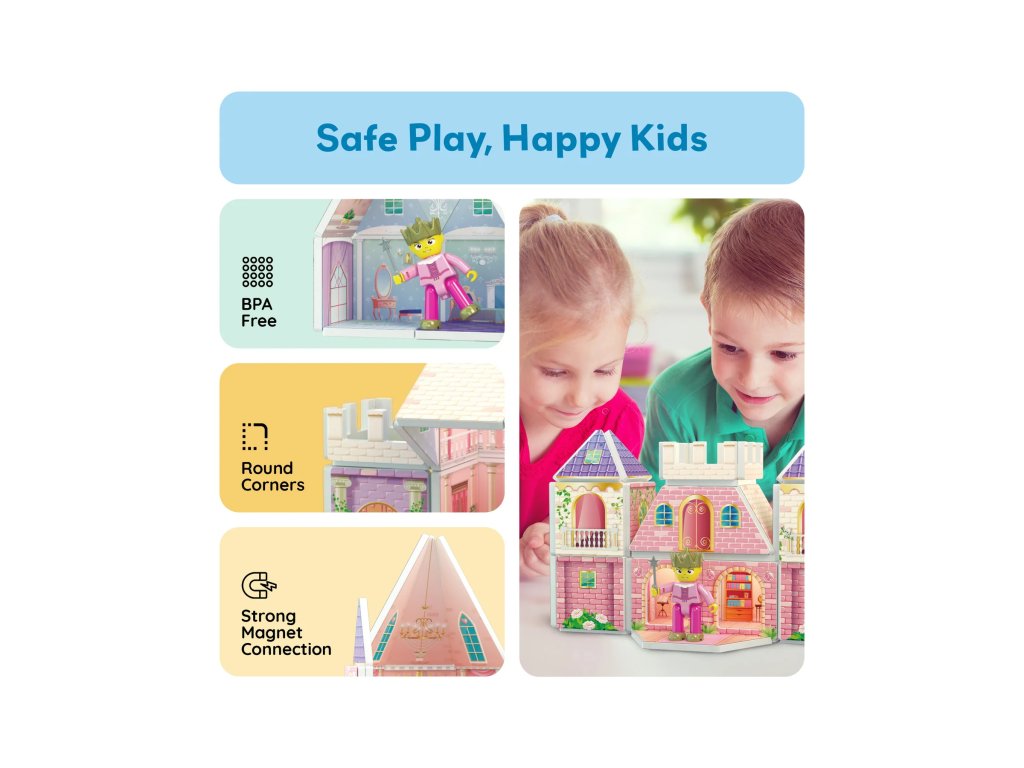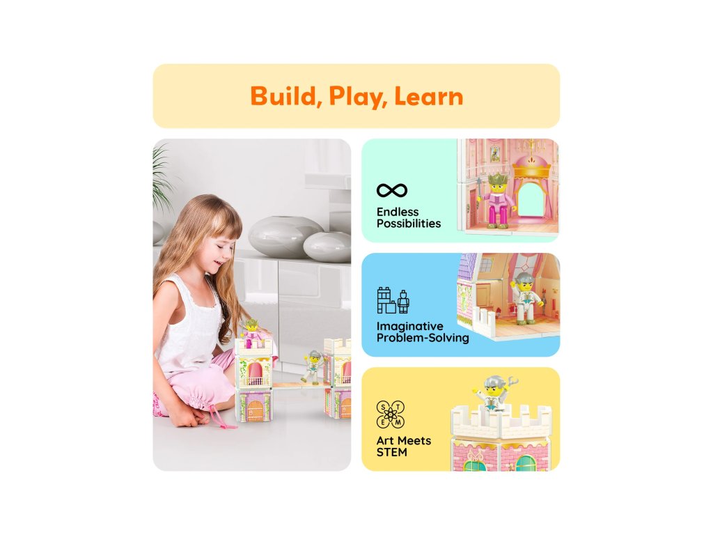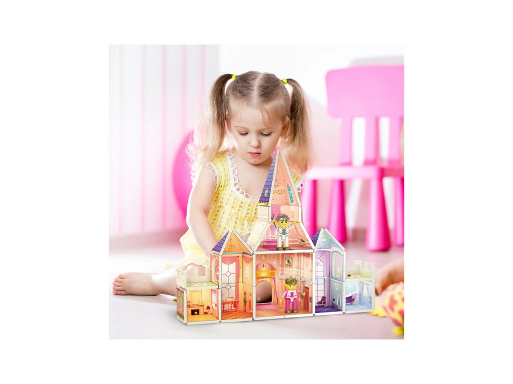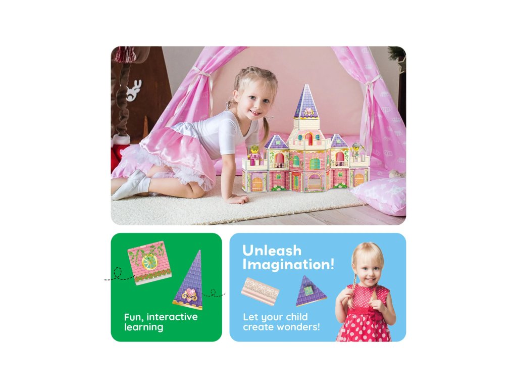 Postavte si vlastní pohádkový zámek! Sada Princess Castle Set obsahuje 60 dílků s oboustranným potiskem a dvě figurky, díky nimž se hra mění v magické dobrodružství. Děti si mohou vytvořit věže, balkóny či celé paláce a zapojit do hry své oblíbené pohádkové příběhy.