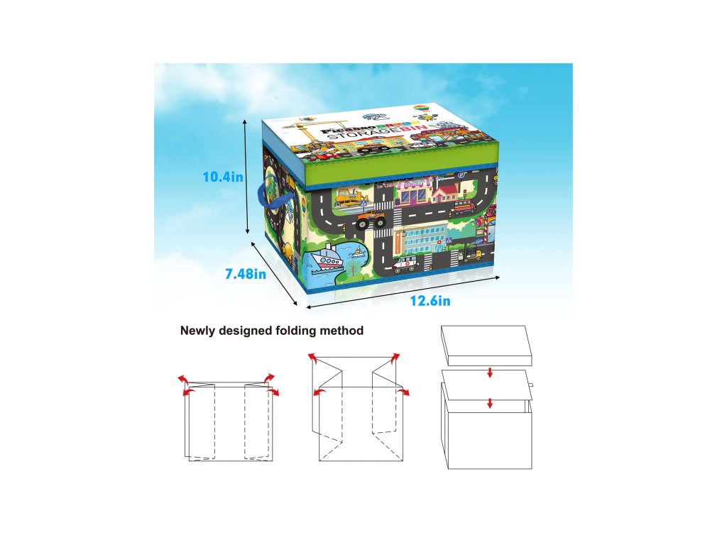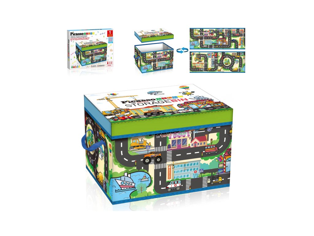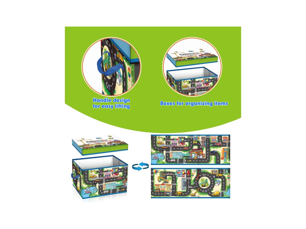 Po rozložení může box sloužit i jako hrací podložka s motivem města, na které děti mohou okamžitě začít stavět a hrát si.
