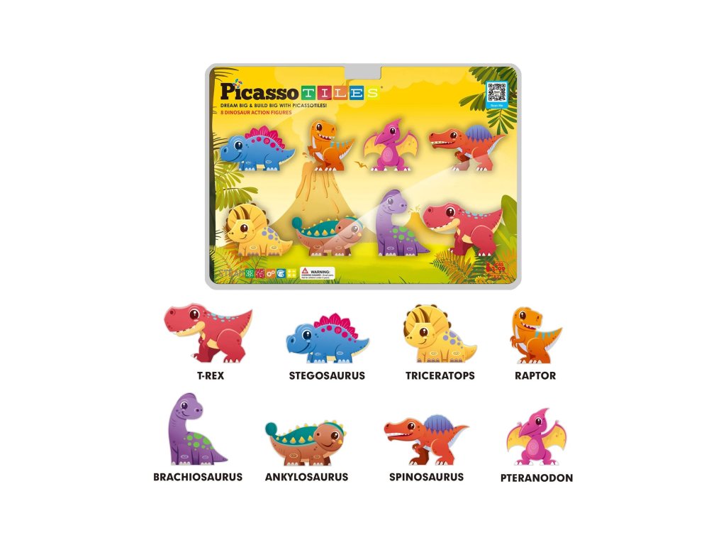 - 8 magnetických dinosauřích akčních figurek: T-Rex, Stegosaurus, Triceratops, Raptor, Brachiosaurus, Ankylosaurus, Spinosaurus a Pteranodon.