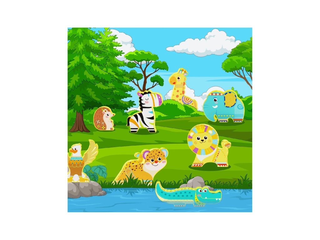 - 8 safari akčních figurek: Slon, Žirafa, Aligátor, Zebra, Lev, Levhart, Ježek a Orel.