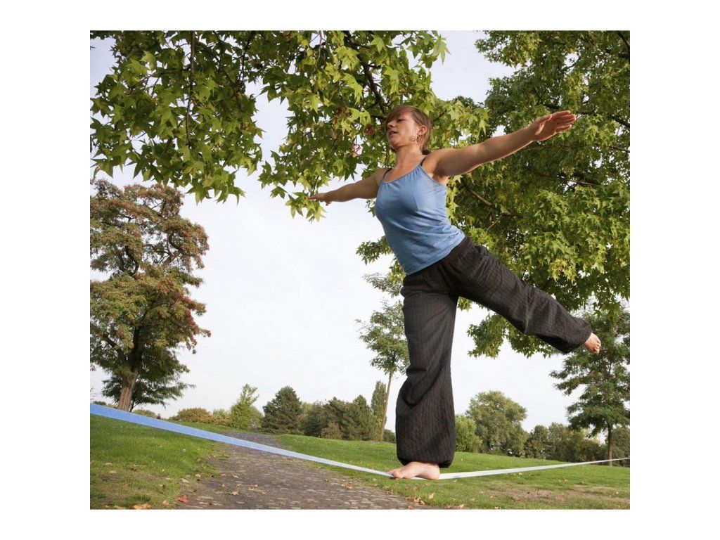 Slackline jednoduše napnete mezi dva pevné body (např. stromy nebo sloupy) a můžete začít balancovat.