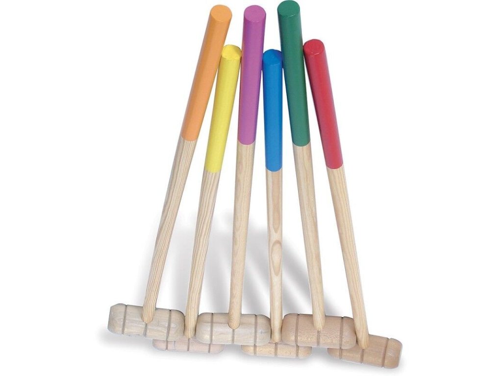 Velký kroket pro 6 hráčů. Obsahuje šest palic, deset branek, šest koulí a dva kolíky. Dřevěné doplňky jsou barevně rozlišené. Vše zabaleno ve velké tašce na zip.