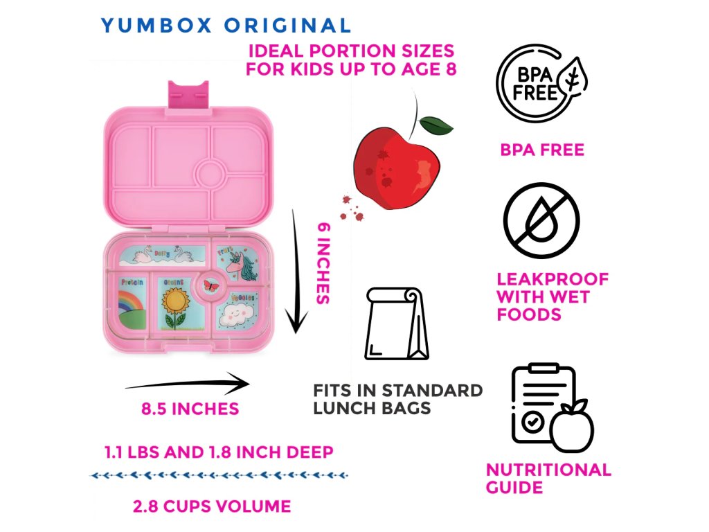 Yumbox Original je dětský svačinový box, který promění každodenní svačinu v malý zážitek. Díky šesti praktickým přihrádkám si každá dobrota udrží své místo. Ovoce zůstane čerstvé, krekry křupavé a dip nebo jogurt bezpečně uzavřený bez rizika protečení.